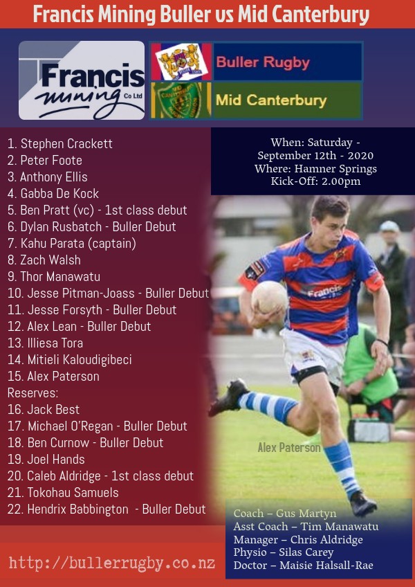 The Buller team to take on Mid Canterbury this weekend is as follows: Congratulations to the following players making their Francis Mining Buller 1st Class Debuts, Ben Pratt (VC), Dylan…